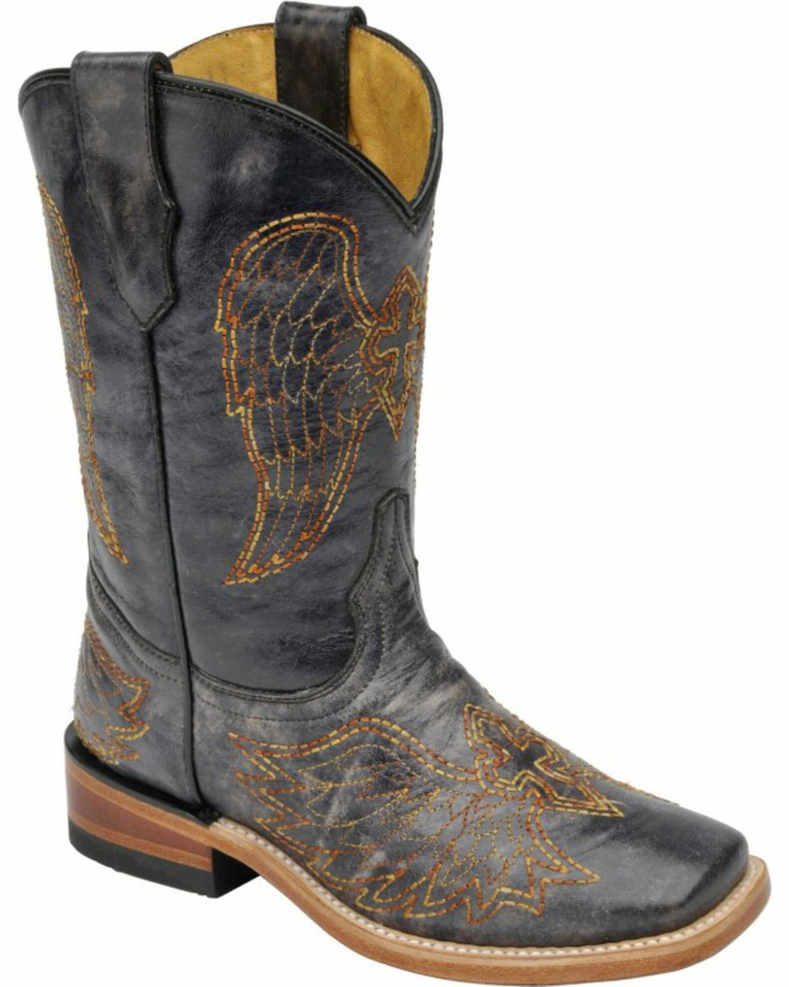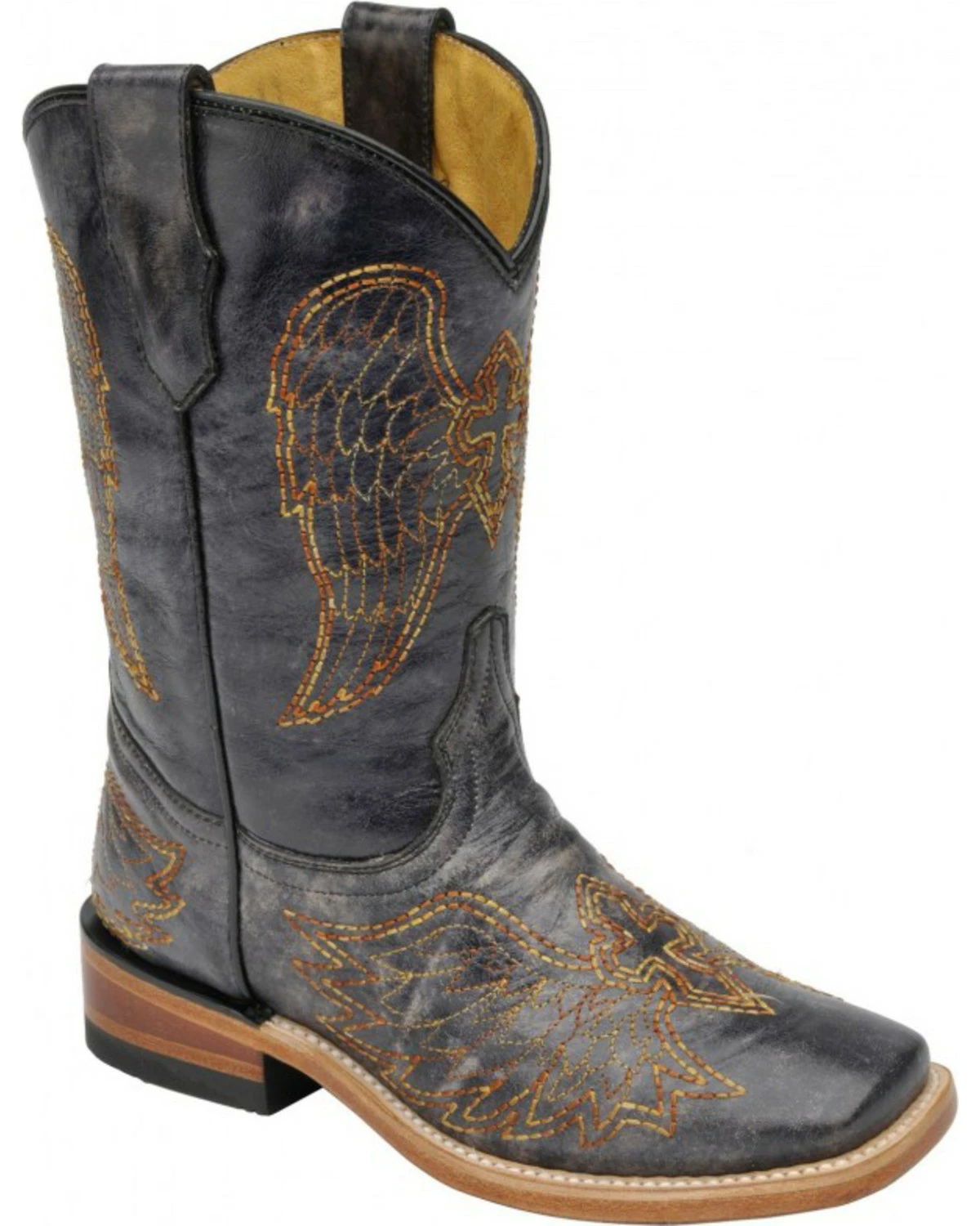 Corral boots are handcrafted ensuring a western boot that is unique in design and incomparable in quality. These Corral Wing and Cross boots are sure to be your child’s favorite! The black leather has a slightly distressed finish with gold cross and wing embroidery throughout. These boots will look great with jeans or a cute western skirt or dress.
