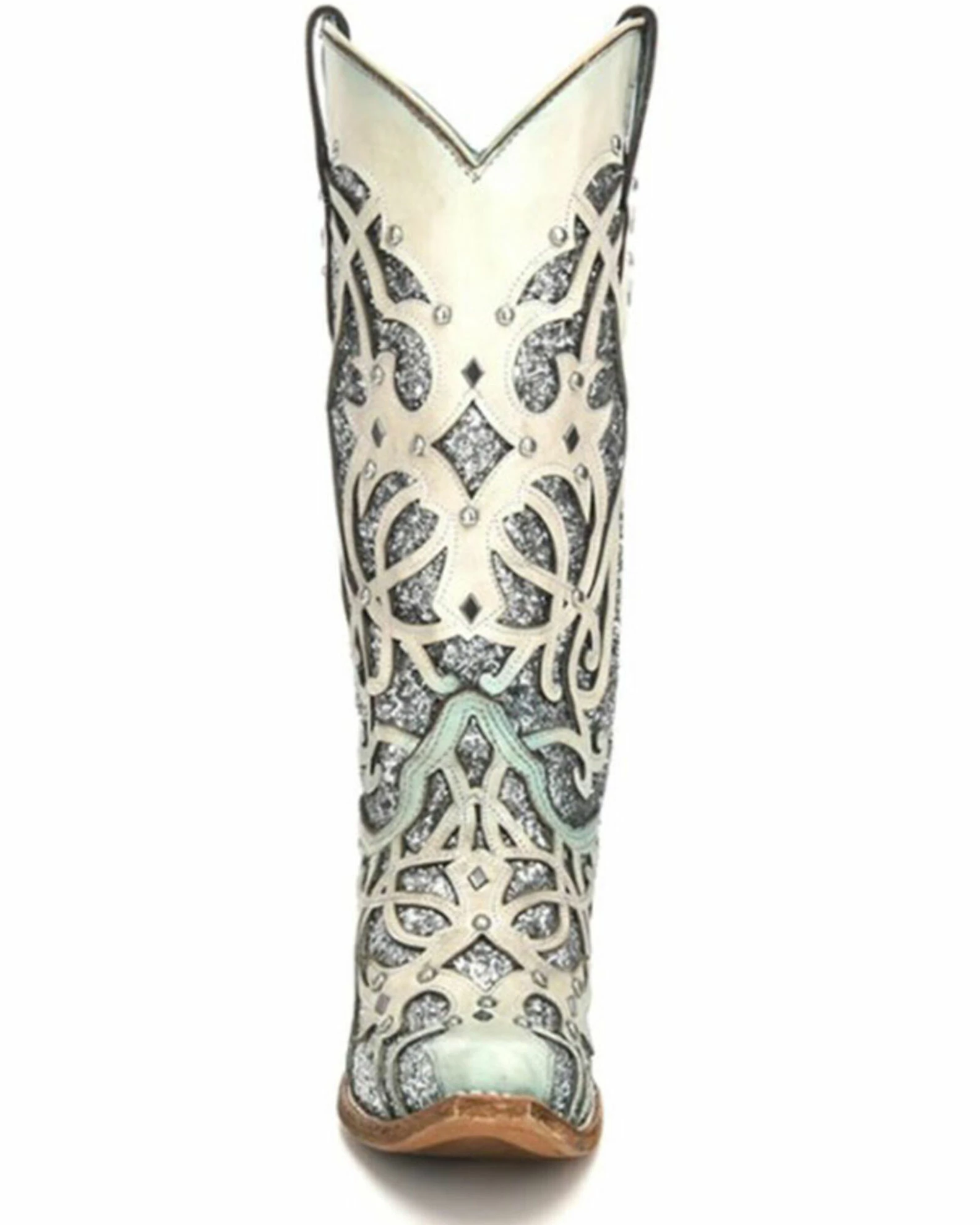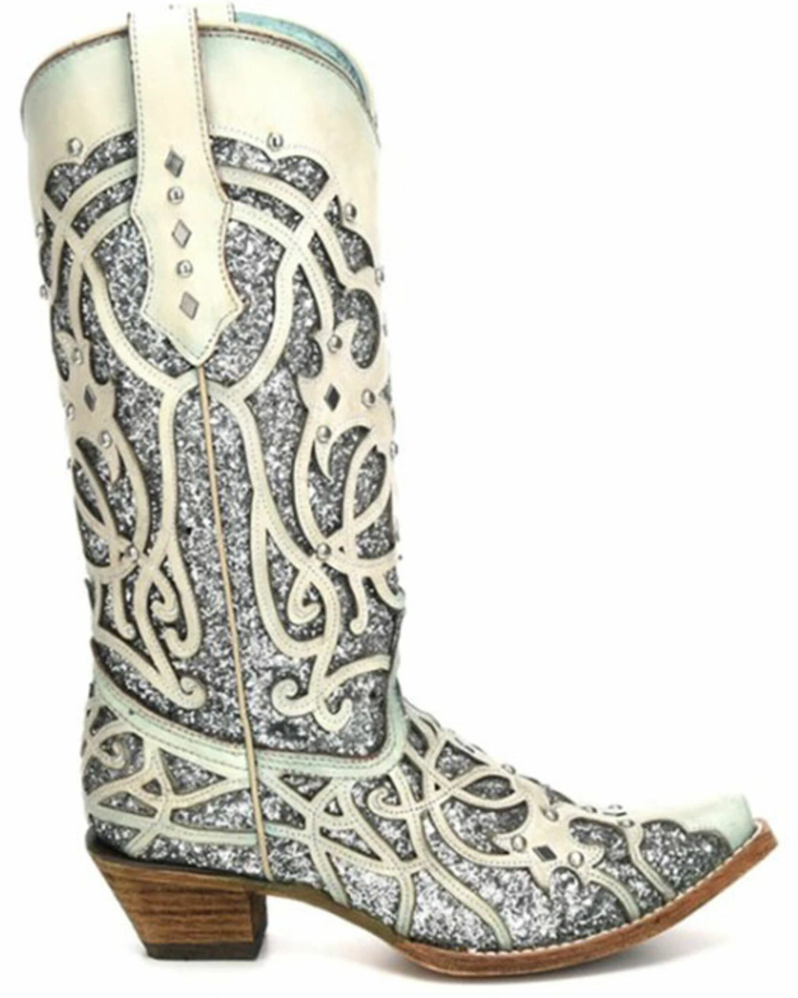 Dance the night away in style when you pull on these western boots from Corral. These boots have leather construction with a striking glitter inlay that designers call the chameleon sun effect. When you wear these boots in the sunlight they change to a beautiful purple color. The studded accents and embellished accents will make these your go-to party boots. Light up any room when you strut in wearing these boots from Corral.